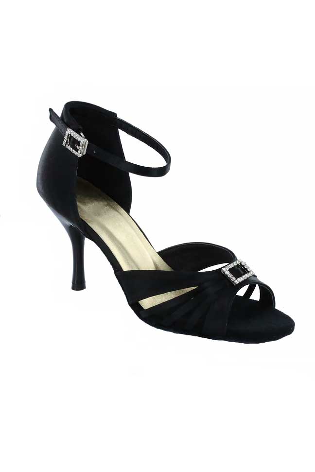 Κομψά παπούτσια χορού Go Dance σε μαύρο σατέν χρώμα με μεταλλική αγκράφα μπροστά και πλαϊνή μεταλλική αγκράφα καθώς και απαλά λουράκια με σουέτ εσωτερική επένδυση.