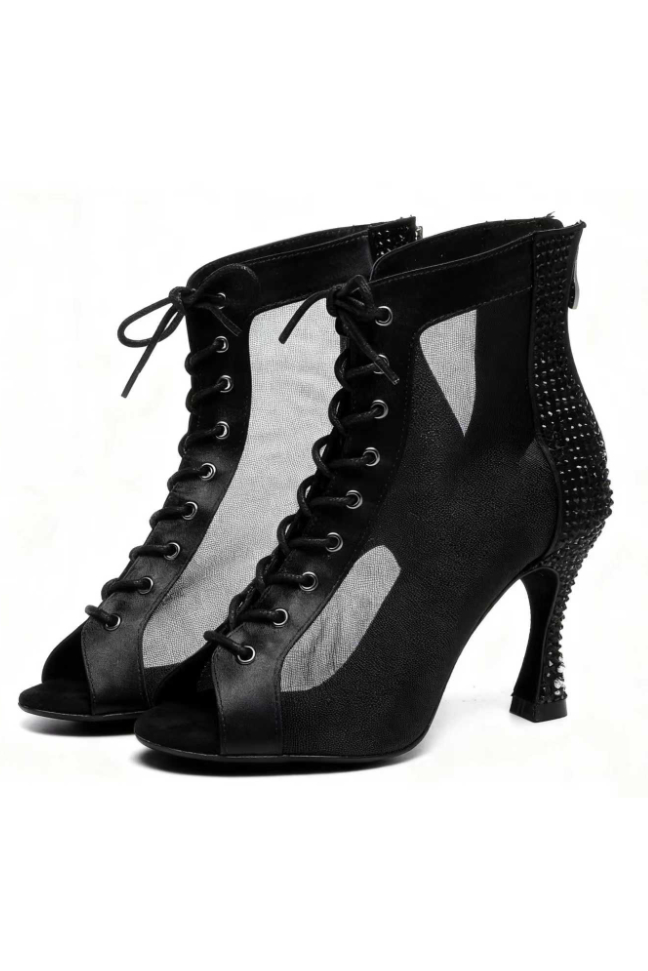 Γυναικεία μποτάκια λάτιν χορού Go Dance CD002 με πολλαπλές επιλογές τακουνιών, δικτυωτό πάνω μέρος και κορδόνια σε μαύρο χρώμα. Απαλή και άνετη γραμμή, σόλα από λάτεξ.